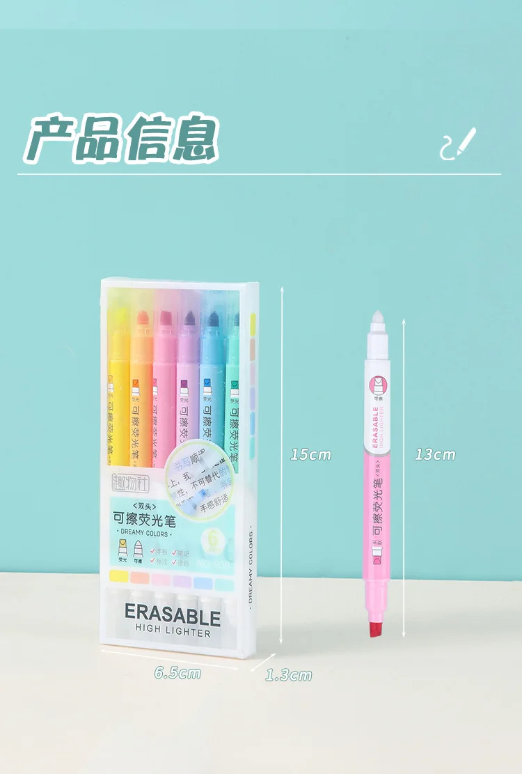 6pcs Erasable Highlighters Pastel Markers Dual Tip Fluorescent Pen for Art Drawing Doodling Marking School Office Stationery