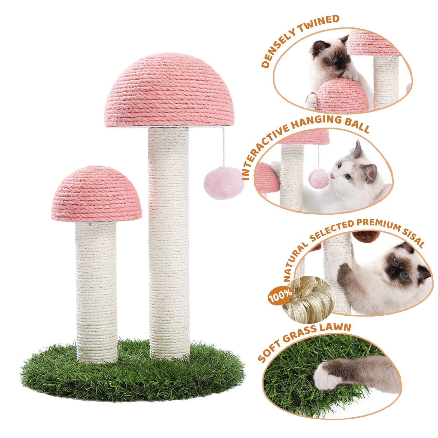 · 【Creative Design】- Mushroom cat scratching post, a cute mushroom-shaped appearance with a dangling ball, attracts cats’ attention and stimulates their curiosity to play and climb, allowing cats to play independently for a long time and bring many games pleasure. Sisal decoration on the outer layer helps cats maintain healthy paw habits and satisfy their natural scratching instinct. The artificial turf base can provide a comfortable resting and sleeping space for cats.