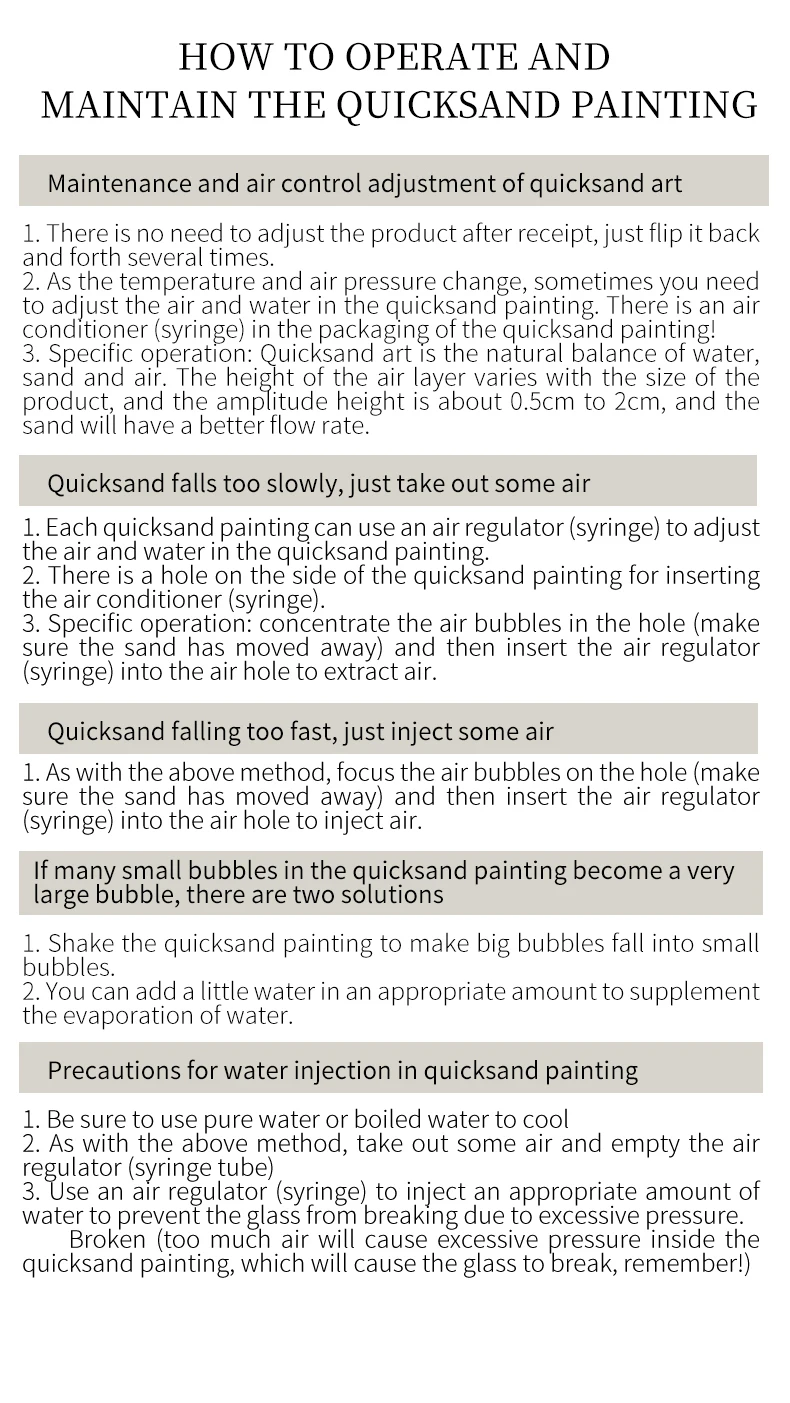 *If there are few air bubbles, please let the quicksand stand still to the bottom, the air bubbles are on the top, and then shake, it will generate more small air bubbles, and it will flow more slowly.